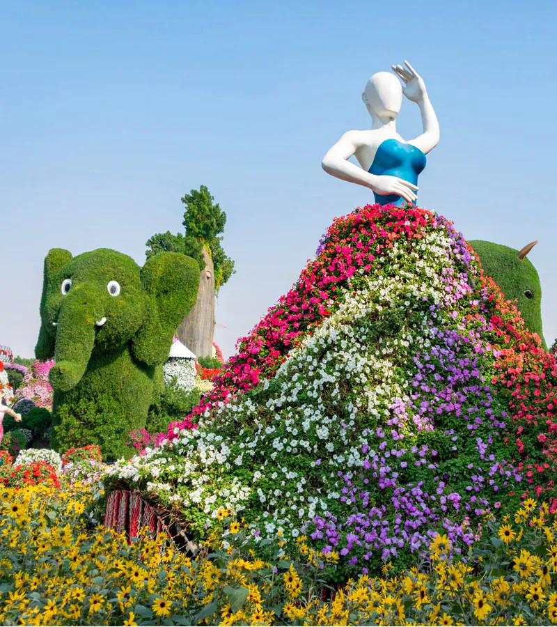 میراکل گاردن دبی نه تنها به دلیل تعداد بالای گلهای آن شناخته میشود، بلکه به خاطر طراحیهای خاص و منحصر به فرد مجسمهها و سازههایی که با گلها پوشیده شدهاند نیز مشهور است.